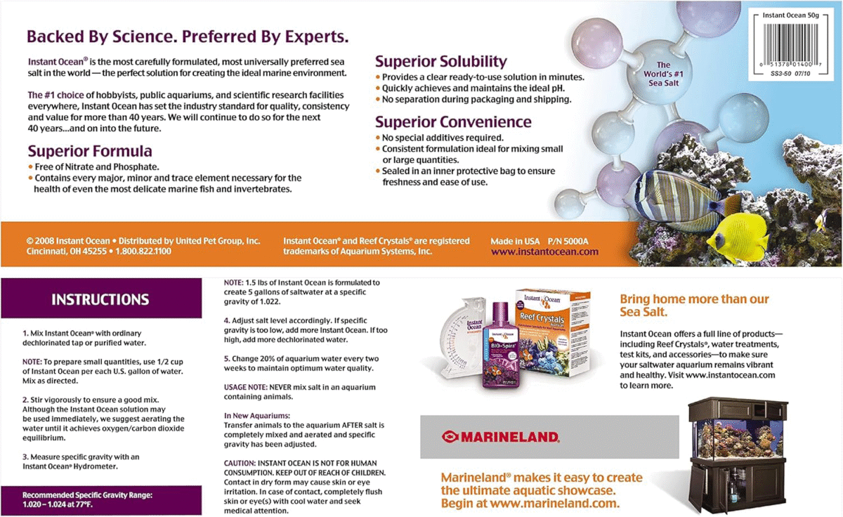• INSTANT OCEAN SEA SALT: The industry standard for quality, consistency and value for more than 40 years.