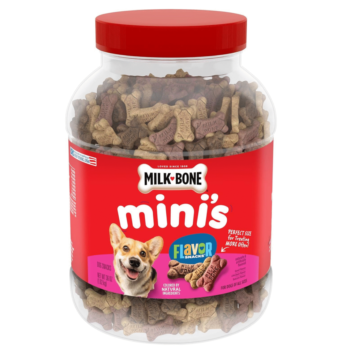 - Contains one (1) 36 ounce canister of mini dog biscuits in 3 tasty flavors: beef, chicken and bacon
